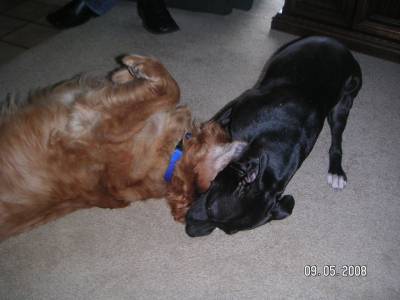 The meet and greet with Sam, resident Jake and neighbor Lake went well over all.  Lake is a year old and while Dora loves the in your face greeting, Max wasn't in the mood and let Lake know immediately........ Lake was soon on his back being submissive and all was fine after that.  Coulter the Cat made his appearance and Max was a bit too interested for Coulter, so we will watch and let him adjust to the cats.  Dora chases them and waps them with a paw, but not sure yet what Max will do.