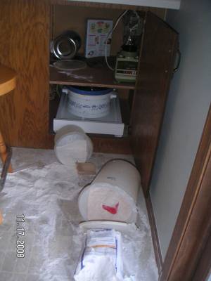 Maxie may be a senior but boy can he pull some puppy antics. He figured out the cereal was kept in the cabinet in the kitchen island, and figured out how to open the door, take out the tupper ware containers of cereal as well as the boxes. He gave the tupper ware containers his best shot at chewing the covers off.  We have the xrays to prove it, pieces in his intestines and larger pieces in his stomach. This too shall pass.  So ok, we decided to put the heavy kitchen island chairs in front of the cabinet, and since the heavy carpet shampooer was out, plant that in front of it too. Aah did I mention he has a strong head and will? Yep, got home and he had moved everything out of his way and took out all the napkins along with the NEW cereal boxes. So ok, that means being baby gated in the hall while we are at work, and keeping the laundry room door closed.