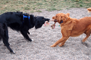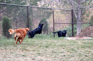 Max is doing amazing!! He has improved so much in a week! He now goes out with a female Lab named Sasha all the time. For some reason or another, he loves her! He has gotten so much better with the big dogs. He now tries to play, he's fun to watch. I don't think he quite knows how to play so he watches the others play and then tries to join in. Today I had him out with Sasha and my dog, Leo. He gets along really well with Leo too and they even played tug-of-war (see attached picture!)! All three chased each other too (picture). Max played close attention to Sasha and Leo, he seems to take his ques from other dogs once he becomes used to that dog. I think the problem with him and other dogs has a lot to do with the introduction. He seems to do fine once he gets to know the dog. We have kept his play groups small as he does become overwhelmed when there are too many . We have also noticed that Max pays a little too much attention to the little dogs so we keep him separated from them. He is doing so well and I think he would do fine in a home with another dog once he becomes aquainted and placed in the pack. All this boy needs is a chance to prove himself!!