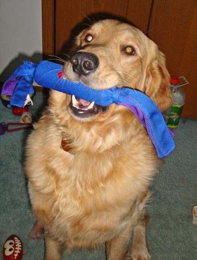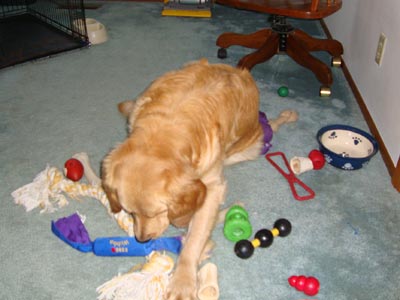 Now for an update on Hunter or as FD has been calling him, Mr. Hunter Happy Pants. Hunter is a very happy boy. His whole body and his butt just wiggles when he sees FD. And the longer he has been here the more comfortable he is getting. He sometimes whistles with one of his toys in his mouth. He loves to play tug of war with his huge braided rope twist. He has discovered the tennis balls but has not quite figured out what the retriever in his breed name means. Hunter can be quite the ham at times. He can carry 2 big nyla bones in his mouth at once. Of course FD then tries to tempt him with another toy and the bones drop and the game starts all over again.