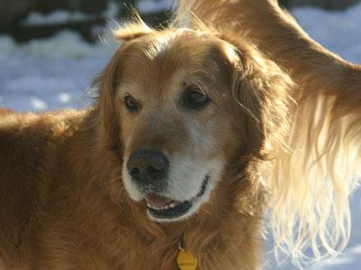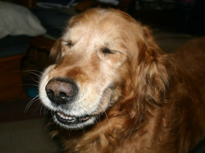 It is with a heavy heart and tears in our eyes that we write this final update for our sweet MoJo. After two really good weeks, during which he was healthy and happy and finally pain free in his back and in his mouth, our sweet boy took a turn for the worst Sunday. He seemed quiet, low key and kind of lethargic although he was eating well (and finally eating a good food). We thought maybe we had just gone a little too far on our little walk on Saturday, so we took a very short one on Sunday. He lagged behind instead of pulling on the leash, enjoying the sniffs while we coaxed him along. Monday morning was more of the same, we had to wake him to go outside in the morning but he ate his breakfast and said goodbye to his early departing foster mom at the gate as usual. Monday evening FM got the leash out to take MoJo to his PT appointment and instead of trotting to the gate, he laid down on the deck and didn't want to get up. We finally got him up and in the car and drove to Dr. Julia's office, where she listened to his heart and had trouble hearing the heartbeat, it was muffled. She had us rush him to the vet because she was concerned, telling us it was probably nothing but just to be on the safe side. We arrived at the vet and saw Dr. J immediately, who also had trouble hearing his heartbeat and his abdomen was rigid, she was very concerned and ordered a chest x-ray. After the x-ray, MoJo laid down on the floor and wouldn't get up with any amount of coaxing and his breathing was very labored. Dr. J believed that MoJo had a pericardial effusion, which is an accumulation of fluid around the heart, likely caused by hemangiosarcoma, a cancer unfortunately all too common in Golden Retrievers. This might explain the anemia that we were never able to find a cause for and couldn't resolve. The prognosis for this condition is very poor. We discussed taking him home and bringing him back on Tuesday for an ultrasound, but watching Moe on the floor, how he was laboring to breathe it seemed clear that wasn't the right thing to do. We were concerned that we would take him home and he would suffer a heart attack, suffering and laying in pain, and we just couldn't do that to him. So, with his foster parents holding his paws, kissing his nose and telling him how much we love him, we sent MoJo to the Bridge. It was the most difficult decision this foster family has ever had to make. There is a huge hole in our household without MoJo, he had become a treasured part of our family and totally wormed his way into all our hearts. Sitting here typing this update, I keep waiting for the gentle nudge at my arm he always gave me when he wanted his ears scratched. His favorite place to lay in the evening, by the dining room table where he could see everything, is sadly vacant. We thought that MoJo had several more months to live, we are just stunned that he is gone. Yes, he was old and he hadn't been healthy for a long time. He had been kept in a small room for two years, as a result his back end had no muscle mass and when we picked him up he was scared to be in the car, shaking like a leaf. But after a few weeks, he actually liked to ride in the car, he was gaining strength in his back end and didn't seem to be so frightened. He'd play with toys, carry them in his mouth and squeak them like Wyatt and Sassy. He came out of his shell, his head and tail were up and wagging, and he seemed happy. He was an amazing animal, and we miss him terribly. MoJo's foster family would like to express their deep appreciation to Dr. James Winsor, who graciously sponsored MoJo and helped pay his vet bills. Our deepest gratitude goes out to Suzie D, Judy D, Gene B, and Aunt Pat and Uncle Rick O for their financial support that allowed us to take MoJo to the physical therapist/chiropractor who gave him so much relief from his back pain. He was like a new dog as a result of those visits, and it made his last month comfortable and pain free in his back for likely the first time in many years. MoJo thanks you, and so do we. Godspeed, MoJo. We will never forget you. All our love, Your foster family