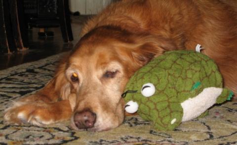 1/10/06: Molly arrived at our house with enthusiasm on 01/07/06. She is 8 years old, 60 lbs., and fully house trained. She was an owner turn in to an Iowa shelter as a result of a move. Her owners indicated that she had been a house dog and had gone through obedience training; she is very responsive and treat motivated. She handled transport and introductions like a world traveler. She bounced right up to me for some affection, ran into the house, located the dog toys, grabbed one and settled right in. She met resident dog Kellie with a quick sniff, and ignored the cats. She LOVES dog toys, and managed to de-stuff Flamingo Fred within a day of arrival. She can spend an hour gnawing on a Kong, and carries a stuffed animal around most of the time. She will join you on the couch to curl up next to you, and with gentle head-butts or a paw, will let you know she needs a little lovin. She might bark when she wants to play, or just needs your attention, and she makes some very cute play noises. It was noted in her file that she has a hip problem, but I have seen no indication of it. She RUNS up the stairs, RUNS down the stairs, RUNS into the house when she's done doing her business, and RUNS to find a toy to play with/carry around. On occasion, she will find the dog bed, and do a dramatic flop down onto it, like she's ever so exhausted (drama queen). I haven't seen her truly exhausted yet, but she sleeps well and is currently testing out several locations to find a favorite. She is fit and trim at 60 lbs., and walks very nicely on a standard leash. She is UTD on shots, but is currently being treated for an ear infection, and will be having a small cyst removed. Molly appears to be quite adaptable so far.