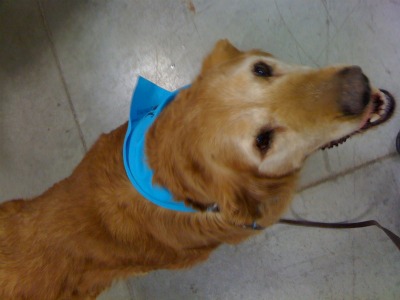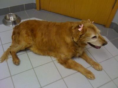 Montana (or "Tana" to her friends) came to live at my house today. She is 10 years old and weighs 83 pounds. Like many seniors, Tana has arthritic hips and knees. Her previous home was a heated barn which is not where an old gal with stiff legs wants to be! She is very gentle, sweet and cooporative. She was groomed before she came to RAGOM, so she is sporting some ribbons on her ears.