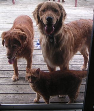 Life has been a bit better since that foster alpha female Lab went back to the Humane Society. Boy she was scary, chasing me all over the house and deck, jumping up and down, wanting the toys, etc. Gma Reba and I get along just fine, hang out, chase balls, eat without problems and we both like the cats. I'd never seen or been around cats before, but hey, they're cool. Well, ok when I have a rawhide bone I don't want anyone bothering me.