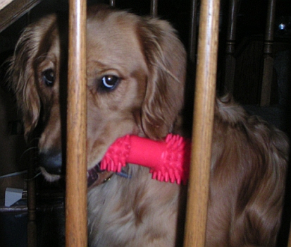 Have been on a lot of rides, checked out the neighbor kids, met a couple new dogs...which weren't all friendly I might add. Went to a pet store. Whoa, you outghtta see the stuff there! I was a good boy so got a big old Booda toy. Boy, can I swing and tug with that thing. I have been a good boy and so sleep in the bedroom with the rest of the family. They keep the door shut....like I would want to wander around a dark and strange house at night! I have had no accidents in the house as I bark and get frisky to let them know it's time to go out...like, now!! I don't like moist dog food, go figure, but do go for the Iams doggy treats. I'm friendly and love being petted and having my ears scritched.....and being praised for being a good boy.