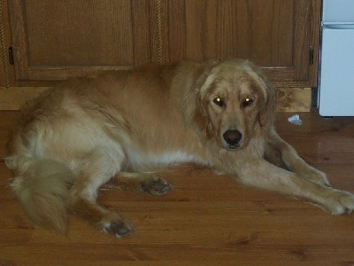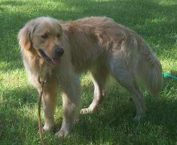 Hi! I want to tell you about my hips. I got word from an "ortho specialist" that I do NOT need surgery, and I DO have arthritis. She suggested that I gain weight and build muscle. In the meantime I should see another kind of doctor to check out my nerves. So, I met a woman named Ms. Neur Ologist and she checked me out really well. She kept pushing on my hips and I asked her very politely to stop, because that kinda hurt a little. She introduced me to Mr. Ortho Paedics and he kept moving my hind legs around funny, so I had to ask him to stop also, because I really don't like to be so uncomfortable. They agreed that I walk wobbly and have minor pain when they move my hips and tail around. They do not know why. They don't know if it will ever become a problem for me, or if I will just have arthritic pain and nothing else. They think that there is no real concern because I am so active. But, good news! Twice a day now I get little pieces of bread with a little crunchy thing in the middle. They said that would make me comfortable and reduce any swelling that I might have in my joints. I sure feel good and have extra spring in my step. I'm not so stiff when I get up in the morning, either. Bad news: they want me to be on complete kennel rest for 30 days. I HATE kennel rest; boring boring boring. I can only go out for potty breaks. Sometimes I cheat and walk around the house a little, but if I start playing with my dog-friend then I have to go back in the kennel. I don't complain, I really don't, I just give Foster-Mom a really sad look when I go in. That's about it, that's all we know about my hips. Seriously, my wobbly walk bothers the humans a lot more than it bothers me - I could catch every chicken in this yard if I could get off this leash! (I've caught 3 already).