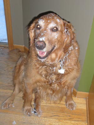 He was also very goofy. He loved playing with Belle, and when he wasn’t right next to mom, it was because they were playing. And that was a lot of dog playing – Murphy was 105# and Belle is 80#. He did the “full-body-wiggle” when it was time for his daily walks with mom. But he really went nuts on Saturdays and Sundays when dad was home to take him on 5-mile walks. He loved the snow, and was very fond of doing snow angels, being nice enough to bring in lots of snow for us to enjoy in the house.