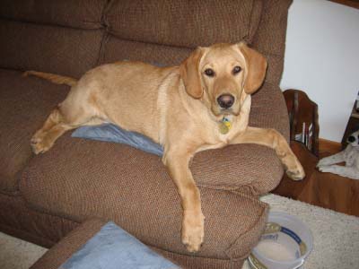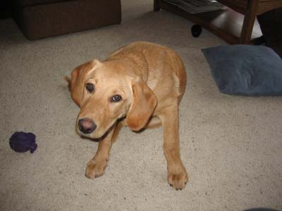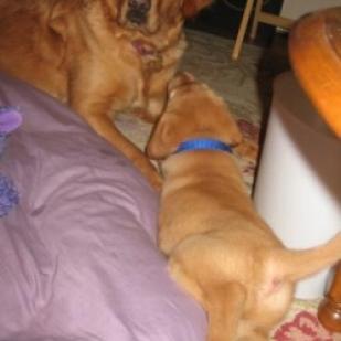 Murray is more independent than Teddy. He doesn't like being alone for very long either, but can tolerate a little quiet time on his own every once in awhile. Though I suspect he just needs a break from Teddy sometimes. There's another picture below of Murray taking a quick break from playing with Ted. Murray is quite a bit smaller than Teddy, has a smaller appetite, and is more calm. He just seems to be more thoughtful. I think he's going to be a very smart dog! Though probably on the small side for a Golden.