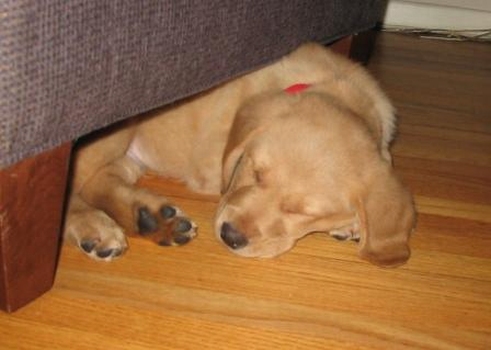 Teddy is getting so big! He loves to play under furniture and has been teasing Murray into playing and then running under the big chair in the living room, but he's getting so big, he gets stuck when he tries to come out. I've added a picture below of when he got stuck under the automan and just fell asleep there. So cute! He's still a big baby, though. He cries the most to be let out of the pen when they wake up and he cries if he ever finds himself alone in a room. He's so funny; he doesn't run around and look for anybody, he just sits in the middle of the room crying until someone comes back. It doesn't matter who it is; it could be me, my resident dog Daisy, or Murray. He just doesn't want to be alone. I think Teddy would do best in a home with another dog. He needs the comfort of another being in order for him to be happy.
