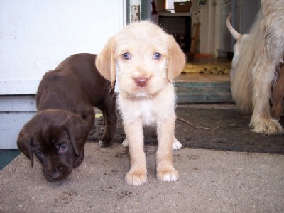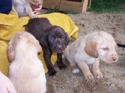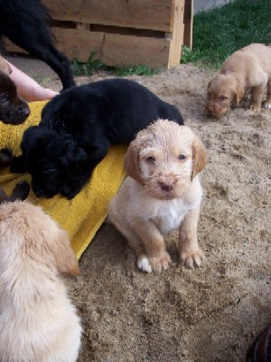 Mystery is the smallest of the puppies and also the thinnest - so we have been working on getting her a little extra food. After all the pups have eaten, I make a special little bowl just for her, she even gets to eat her bowl of food while standing on the counter - so she doesn't have to share. Mystery is a mellow little cutey that looks like she could have some Border Terrier in her.