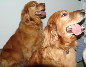 Zeon has storm anxiety. Natasha has a habit of not letting Zeon get attention. If Zeon is getting petted she has to get petted and Zeon cannot walk in front of her when they are on walks. She has to be the leader. They do not beg for food, bark or growl. Natasha did bark at another Golden Retriever in the building but I think she was just saying hello.