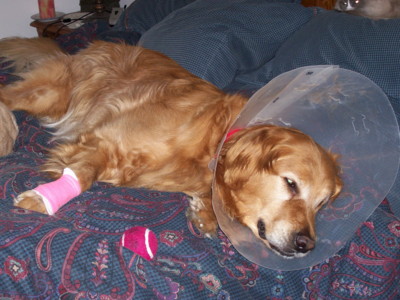 And, silly me, the sore on Nugget's paw (as seen on his new photo) is not a hot spot but rather a strange cauliflower-like growth that has a stem or trunk. This will be removed next Wednesday, along with unblocking one of his tear ducts. He does not like being cone-head, and moves around the house like a bull in a china shop :)