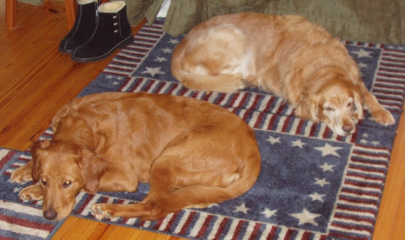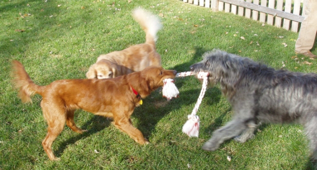 Otto is also getting along great with our 9-year-old Golden (Sandy). Otto's favorite past-time (besides eating) is wrestling. He likes to nibble at Sandy's neck and ears to get her to wrestle. She's had to remind him who wears the pants in the family a few times. Since then, he's been a perfect gentleman and waits for her to start the festivities. Although Sandy can hold her own, it doesn't take long before she's pooped. We were getting a little worried that Sandy was getting too much "exercise" so we decided to call in reinforcements in the shape of our neighbor's 95 lb. Irish Wolfhound mix. It's been a match made in heaven! Sandy gets to rest and Klaus and Otto wrestle until they're both ready for a nap. Otto definitely needs to go to home where he can get lots of exercise and/or play with other dogs.