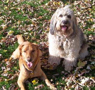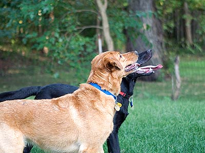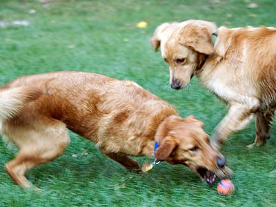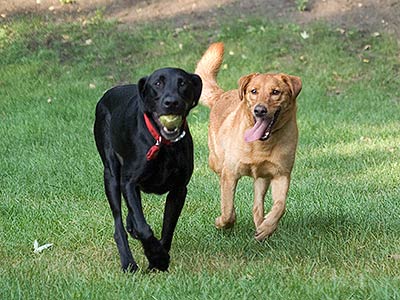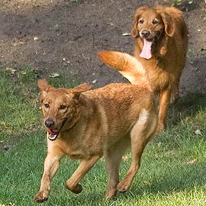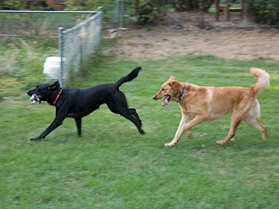 Ozzie returns with the ball, with host dog Robbie just behind him.