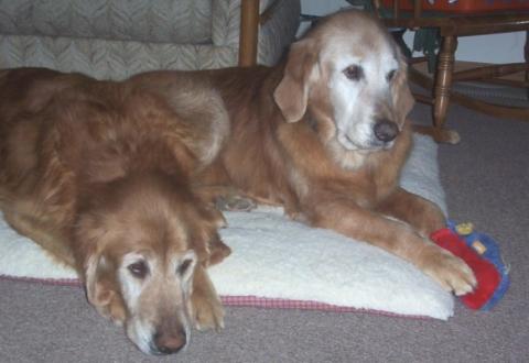 1/5/06: Peyton and Packer are here! It is very obvious this was extremely hard on their owner....he started to cry when he hugged them goodbye. They have had them since they were puppies, and they will need to be adopted together. They are not littermates, but one litter apart. Packer (female) turned 10 last May and Peyton (male) turned 10 in November. Packer is completely white in the face...just gorgeous!! I love those white senior faces! Really nice dogs....seem to be settling in well so far. We have a vet appointment set for Monday afternoon and I'll update after that.....more later!