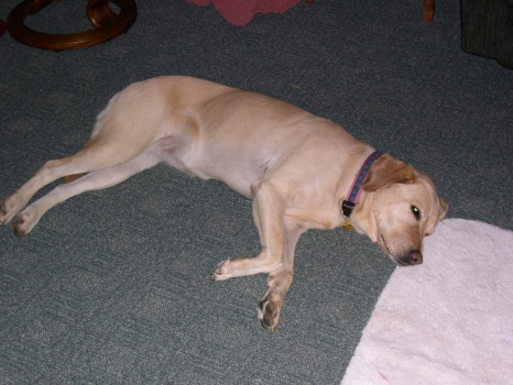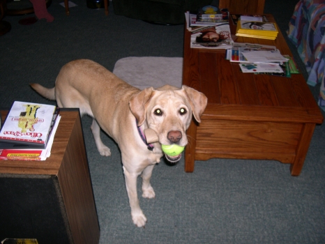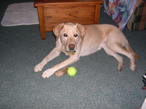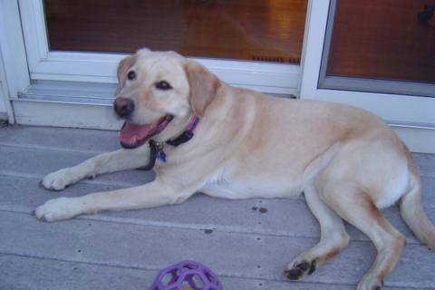 Hi Everyone! My name is Penny; Henny Penny or Penners if you listen to my foster mom. I am a 7 year old yellow Lab. I was surrendered to RAGOM because my owner wasn't able to care for me and my canine house-mate, Bailey 05-187, anymore. I've been well taken care of and loved, my foster mom can tell. I like to carry a toy around in my mouth. I'm house-trained, I have free roam of the house and don't get into trouble, I sleep through the night, and I don't demand tons of attention - unlike the resident canines at my foster home! I get along with everyone here - now. I didn't much care for the little dogs yipping in my face, but that only happened once. I growled a bit and let them know I wasn't an "in your face" kind of gal and they've pretty much left me alone. I don't play with the other canines here and I ignore the cats. I'm very happy to just play by myself. I'd do very well as an only dog. I love to go on walks. I pull a little bit, but I just get so darn excited about all the good smells - I don't want to miss anything!