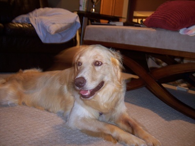He is beginning to play more and more with our resident dog and they have even snuggled up together (which I thought would never happen) at bedtime. We also have a cat at our house that Foxy has never shown much attention to so he would be fine in a home with other animals as well. He really needs or maybe a better word is deserves a home with a fenced yard so he can run around freely with another dog. Foxy is a wonderful boy and with lots of attention and love will bring much Golden joy to his forever family-is that your family?