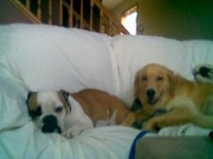 We have a house guest this week and boy is she funny looking. After playing and taking a walk yesterday, mom let us relax on the sofa together. See how cute we are?