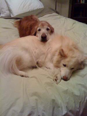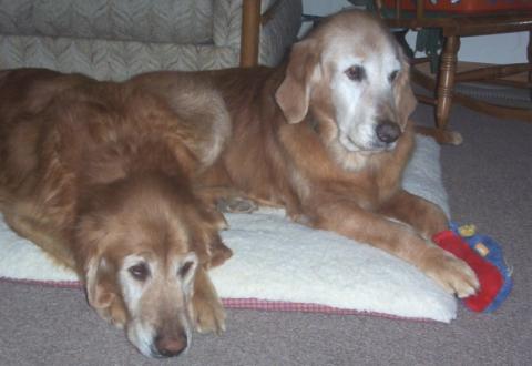 In February of 2006 we adopted Peyton and Packer, 10.5 and 10 year old seniors born of the same parents in successive litters and living together all of their lives. After a very happy year together we lost Packer to cancer despite all the best efforts of the U vet team, but Peyton is still with us and living the good life. He doesn't hear very well and struggles with stairs, but every time we head for the door he encourages me to take him for a walk. Our yard has a large border hedge and Peyton has found two spots with branches he can use to scratch his own back, and that's where we find him every day. Although he no longer has Packer for company, Peyton has resident Blondie and two cats to keep him company - he's a happy 13 year-old boy now! I am attaching a picture of him on our bed with resident Blondie. Thank you for all you do.