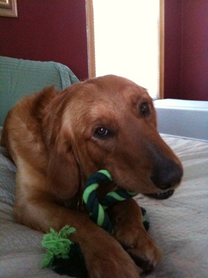 Foster mom and dad are seeing more of my teenage personality now that I am settling in. I do get very excited when you come home and can jump and when I want to play I can get mouthy. I don't bite, I just use my mouth to play. Foster mom and dad say "no" and sometimes even have me go into my kennel until I can behave. Geez...I'm still a kid....but I am learning.