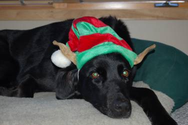 Dear RAGOM: We adopted Raven February 15, 2004. She was rescued by Tamra R – it is a neat story. Anyway, Raven is doing very well and has overcome much of her separation anxiety, which was an issue for several years. She is very happy as an only dog, loves routine but unfortunately life isn’t always routine. Raven does not like it when her pack changes, which is daily with the comings and goings of daily life and that is when she displays signs of separation anxiety – barking, whining, chasing cars as they go down the lane. Fortunately, she is solidly trained to her Invisible Fence and does not follow cars to the road. She continues to gain confidence and can be left alone in the house now for several hours, but we do so only if it is really cold or raining, otherwise she is more content to wait for us outside where she can patrol her space, chase birds and hang with her kitty friends. She is a great dog, a wonderful companion and we cannot imagine life here without her. Thank you so much for the opportunity to give this sweet girl a forever home. Please know that she is dearly loved and well cared for – although she was not happy when I put the elf hat on her and took her picture. She was humiliated, and after I took the hat off, she crawled under our bed (her safe place, would not look at me and did not come back out until she was ready to forgive me. I threw the hat away. Funny dog. Thanks for doing what you do. Blessings, Jean B