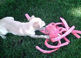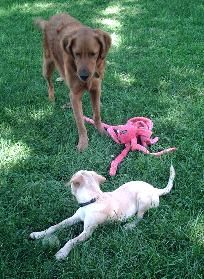 Little Marci is up to about 14 lbs and is approximately 18 weeks old. This little thing looks like more of a Terrier each day - she retrieves so there must be some Lab mixed in also. She loves all the big dogs and plays tug with the rope toys very nicely with them. She doesn’t nip at their heels, just runs after them in a great game of chase. She still naps on my lap, and likes to kiss all over Shelby, the almost 14 year old resident female. She is learning to ring the bells on the back door and does a little whine to ask to go outside. Still is crated at night time and sleeps from 10 till after 6. You will need to meet her to see what a unique small dog she really is. Email PLACEMENTatRAGOM [dot] ORG to see if she has a spot open to visit with your family.
