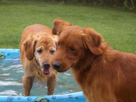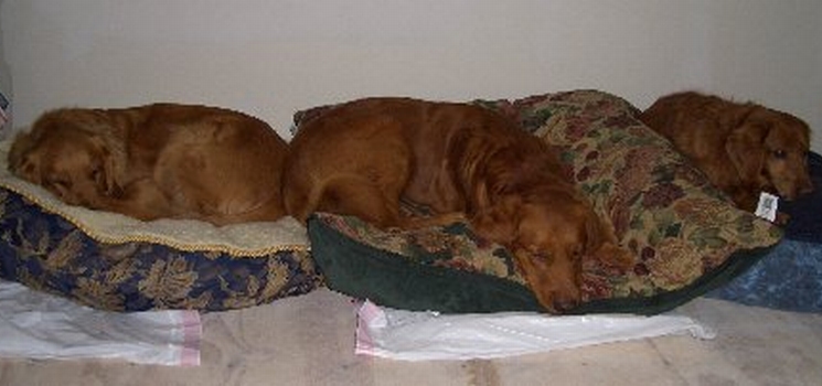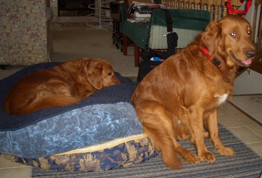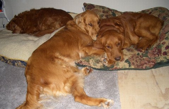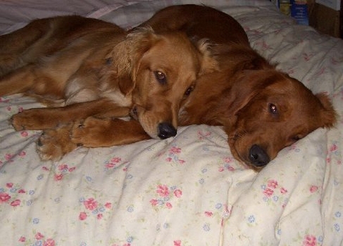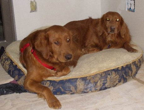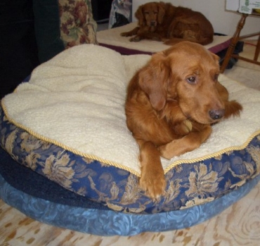 This is a picture of Red and Molly sharing a dog bed while at the, obviously still under construction, cabin. We are hoping to have hot water the next time we are there!