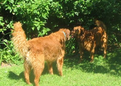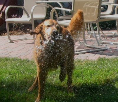 He does not appear to be an active play dog probably because of his age; however, Zoom enticed him to play chase on a warm afternoon and we think he enjoyed it immensely. After the chase, in and out of the ‘fort’, Redd decided that the spray from the garden hose was the perfect way to cool down. Maybe he has forgotten how much fun it is to play, but with Zoom around that may change. If you’re at Zoom’s house, you have to play!
