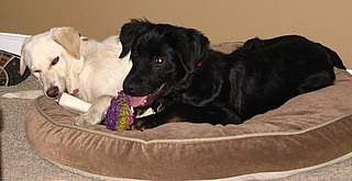 This weekend Reuben's fosters were out of town so he spent the weekend hanging out at our house with Nora 07-375.  It has been fun to see the difference in personalities between Nora and Ru.  Nora is higher energy and loves to run and play and wrestle in the backyard.  She has way more stamina than Reuben.  Ru, on the other hand, is not quite as active, but much more of a clown and more mischievious than Nora.  He is the first one to go grab a new toy (or a new non-toy) to chew on.  He is also up, down and all over the couch like a little monkey.  He has the cutest face - almost always smiling, too. Nora and Ru have shared their food bowls, dog beds and toys all weekend without a problem -- which is a good thing since both dogs seem to think that whatever the other puppy has is the most interesting object in the room.  I've included photos of the puppers enjoying their first Frosty Paws on Saturday.