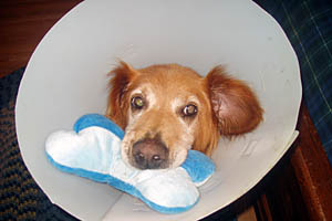 Since you won't get to meet me at the picnic, I let mom take a picture of me with a silly cone thing on my head! The cone didn't stop me from playing with my favorite squeaky toy though! Hee, Hee!