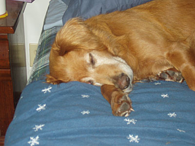 I finally got my stitches out and can run and play again. Yippee! One of my favorite games is called "You Fetch-I Tug". Katie and I play this game. She runs to fetch the ball and I grab onto her collar and hang on as tight as I can! Then I tug at her collar while she's running! That frisky Katie tries to drag me all over the yard! You should see my 'Flying Nun' ears take off in the wind during that game! Mom and Dad laugh when we play and act silly. It's hard work trying to hold on to a 50 lb. moving object! By the end of the day I am exhausted! In fact, last night mom took a picture of me sleeping on her bed! She said I looked pretty cute!
