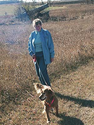 Rosie with her adoptive mom Nancy walking in their prairie after her adoption in 2006.