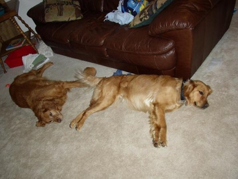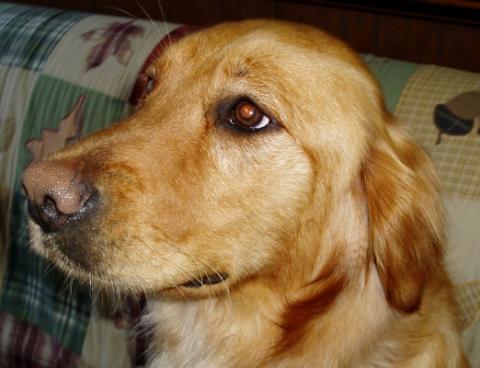 3/15/06: Birthdate 11/24/04 57 lbs. already spayed, she came in on medication for yeast ear infection and just received her Bordetella Intra Nasal and Dr. B flushed out her blocked left ear. She is a nice young gold in color female. Roxy came into my home to the greeting of 5 Goldens and likes other dogs, met a cat at the Vet Clinic and actually backed away from it. Roxy came from a temporary foster home that ran an in home daycare. Roxy was a birthday present for a 5 year old child at her first home, so she is great with children. She loves to run around the backyard and checks the fence line. I stopped at another foster home on my way home from the Vet appointment and she checked the entire yard fence to fence in all directions, so for now I think a home that has a fence might be her best option. She likes to go to the door when someone comes or goes, so obedience training to sit and wait will be necessary.
