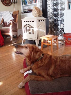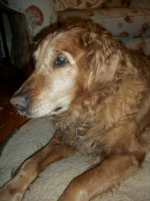 As I read the posts from Ragom folks about what they have to be thankful for this year, I think of many of the same things. Health, family, friends, and of course Goldens; we are truly blessed with them all. As our family sits back and reflects on our blessings in 2008 there will always be certain dogs that have touched us in one way or another. Rudy is one of those dogs. He is a quiet dignified senior with a hint of whimsy in his step. He reminds us everyday that we are lucky to be fostering him. He is a funny boy now that the weather is cold, he stays outside for fewer minutes and then gives his one little bark to come back in. Then it’s straight to the corn stove to warm his old bones, he’ll lie on the rug and stare into the fire with a contented look on his face and then fall asleep for a nap. He takes excellent naps and I join him as often as I can.