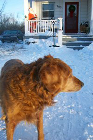 Rudy had a relaxing Christmas and enjoyed the festivities. He especially enjoyed his new chew bone and stuffed mallard. What he is really looking forward to though, is New Years eve, because then it will be very close to the day that he goes to meet his potential family. Rudy has been such a dear boy waiting and waiting for his forever family to find him way up here in Northern Minnesota. The northern lights were shining on the snow last night and Rudy was gazing up at them dreaming his Golden dreams (then he peed on a snowman and came inside).
