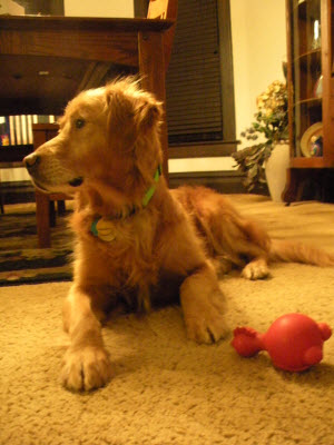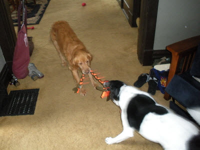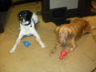 The dog that didn't sit the whole hour we saw him in December (a rather strange quirk he had) is following that command regularly. Well, at least when focused! We have started doing some simple commands, he is really quick to learn and he and his bro both sit and wait patiently until released to eat their gourmet kibble morning and night. Several people have commented that he still looks a little skinny, but it's hard to figure out why based on his joy in food--both from his dish and snuck off the counter, though this mom and dad are pretty well trained to keep the counter Ramsey proof.