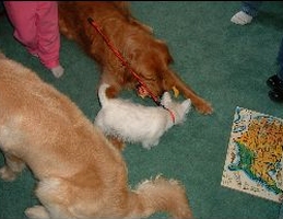 Rusty would do best in a house without children that are 3 and under. That is only because he is a big Golden and he could knock them down easily. He wouldn't do anything intentionally but still has energy and loves to romp. He would love older kids to play with though. I think he would be a great dog for kids to grow up with. Rusty loves to play and fetch.