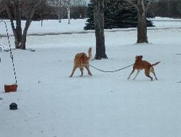 Rusty wanted to show everyone what a gentle boy he is. This weekend he got to meet a 13 week old Westie puppy, that is smaller than some of his own chew toys! Rusty was so gentle and patient, he let this little boy crawl all over him and never minded a bit! Last week when we got some snow (finally!!) he let Maggie take him for a walk!! Give this boy a call today!