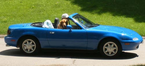 Rusty was an amazing dog. Right from the start we fell in love with him, he had a wonderfully fun attitude and always made us laugh when he came in the room with 3-4 tennis balls in his mouth. If we were too busy to play, he'd just toss a ball down the stairs and go after it. Most of the time he didn't have to play by himself. Especially since Dan retired a little over a year ago, Dan and Rusty became even closer. They would start the day with coffee and pets/massages, going on long walks and lots of playing ball. Ending the day with 'floor time'. His previous owners didn't let him on furniture so Dan came to him. I think Rusty enjoyed his ride in the Miata with the top down too!