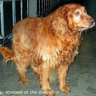 Rusty came to RAGOM in horrible shape. Karen in South Dakota did a great job of cleaning him up. She passed him on to me to treat his ear infections, which are now cleared up. At first Rusty was distant and mildly afraid of strangers. He seemed very depressed.