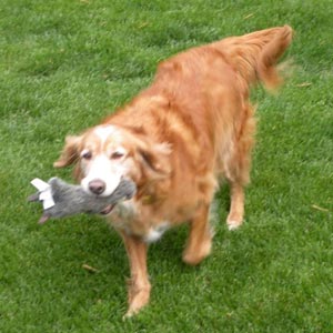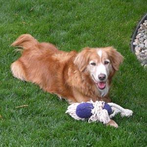Rusty was recently surrendered by a family who no longer had time for him. He is a total delight to have. Rusty does play fetch, and is very active and fit for 9 years old (even vet concurred). Rusty likes to carry around a soft toy (does not chew up), a kong (with peanut butter is great); other hard rubber toys and nyla bones. He really enjoys playing in the back yard fetching a ball or toy, does not bring it back every time yet, but just loves to play.