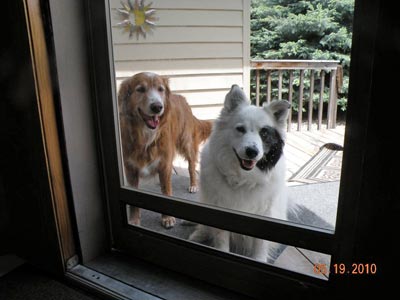 Some new photos of our Rusty boy. One is with his pal Maggie (white) who is the same age. They both really enjoy their daily walks a lot and do very well. Rusty's coat just glistens in the sun and so pretty. He has a very full tail which is gorgeous.