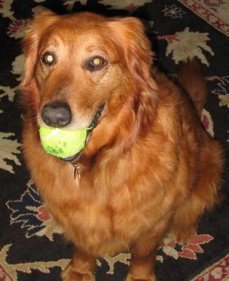 She quickly overcame her stairway nerves ... to the point where the stairs are a bit of a novelty for her, and sometimes she runs up and down for the fun of it! When she isn't running to fetch a ball, she wants to stick close, and she wants lots of attention. Initially I felt like she was needing a lot of reassurance that all these house noises and activites were OK, but she seems to have really quickly moved to a stage where this inside the house business is all very EXCITING, and she seems to be having a lot of fun. Since she likes to be close, should you decide to sit on the couch, she will occasionally throw the front half of her body at you to join you in this activity (we're working on 'down'). She really wants to be a lap dog. With a good running start, joining you on the bed is no problem either, and she'll usually stretch out alongside you.