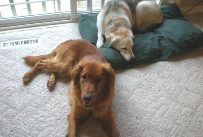 Resident dog Cinder attempted to get him to play with her, but he wasn't interested in her - after all, he DID have his tennis ball!  She'll keep on trying.  :)