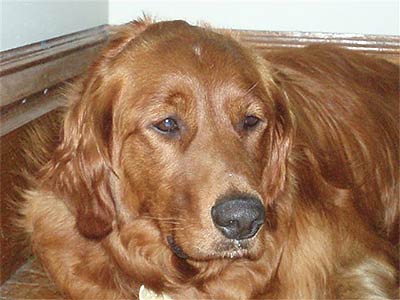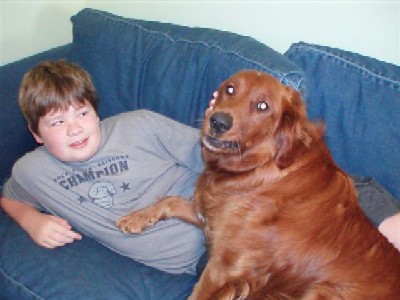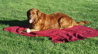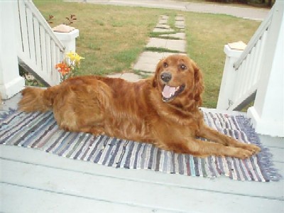 Sam loves lots of head pets ~ especially if I sit down at the computer (so I'm typing with one hand). He loves to catch the Frisbee and small football, but has a little trouble giving them up. We've learned the only way to get him to "drop it" is to sit down on the bottom step of the porch and be at his eye level. Sam's favorite toy is his rubber football, but it could be because that's almost the only toy left (he chewed up a cloth squirrel, duck and koala bear). He also chewed off the corners of a couple throw pillows, but it could've been that he didn't like my color scheme :) He likes to walk on leash and although he hasn't mastered the whole "heel" thing yet, he's getting better on every walk.