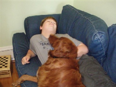 Sam adores our resident 13 year old (real boy) and could spend all of the day following him around. It could be the fact that he always has food in his hands but I think he just likes him. Sam rides nicely in the car and just sleeps in the backseat.