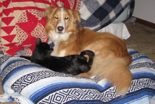 The other picture is of her and our 7 month old kitty. Sandy does very well with her, and thinks it's her job to keep the kitty in line. She often will mouth the kitty around the neck but no harm is done and kitty doesn't know any better. She and I started "dog school" a little over a month ago, and she is doing very well! We have 2 more classes. She is very protective of me around other dogs though! We really wanted her to learn "come", and she is doing better with that. She still knows "roll over" and "shake". Her coat has grown in beautifully, and she doesn't shed much, but you always have wavy white hair on you!