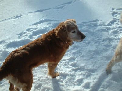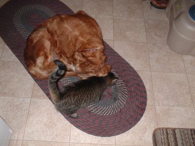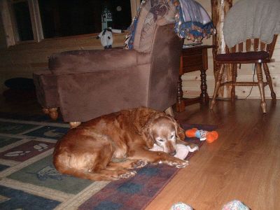 What a difference a week makes. This girl has just done great. She is sitting on command. When she gets excited she has a tendency to jump up, but she is learning that sitting will get her lots of hugs and petting. And what a clown. We were going to go for a walk and I put my mitten down to hook up her and Lew on leashes, and she stole my mitten. Good thing I had hot dog bites in my pocket, cause she was not going to give it up. When I bend over to tie my boots she sticks her head in between my legs from behind and I get a kiss in the face. She is playing much more with Lew. But her favorite thing to play with is the cat. She even lets the cat rub up against her now. And she has taken to Lewie's stuffed toys. Actually she hoardes them. Gathers them all up and lays on them. So I think I am going to get her some of her own. She really needs to do doggie situps. She has a little loose skin from having all those babies. But don't we all! I will be having my grandsons (6 and 3) this weekend so we will see how she is with kids.