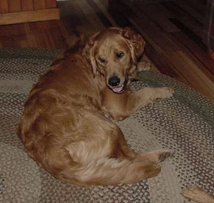 1/12/06: Let me tell you about Satchmo....he could have a name change his name should be Velcro....He is what is known as a gentle giant...He has had a full vet check and is in good shape....he is up to date on all his shots and is a really great big little guy...He has a lot to say and is very vocal especially when he and the pack are left alone ....he's the first to greet you and drag you around....He is older then we thought...he will be 2 in May. He gets along well with the other dogs...he doesn't much like the guinea pig..."he thinks he's a rabbit and would eat him"...he loves to play ball or tug of war or whatever it is that anyone is playing ...We have 3 other Goldens....1 of them is blind...Satchmo is very gentle with Brinkley...they get along famously...He is very bright...you can see him thinking ...we have him enrolled in Puppy classes and will start with him....He likes to walk..we do that daily and he knows where his leash is and will go and get it for you....doesn't like his gentle lead...has already ate one of those...but gets along well and is learning to heel on a short lead...just have to pay attention to him...loves to chase rabbits and squirrels...He loves Drew our 8 year old - talk about a boy and his dog....or dogs, but with 2 other Golden boys..Drew has no loss or lack of Golden love or noses to kiss.....