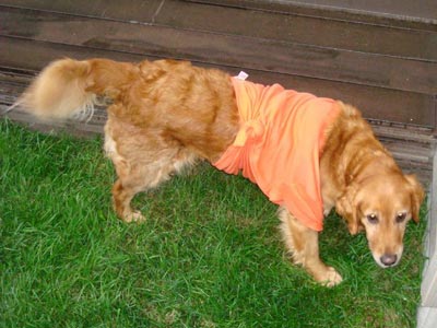 First off, I need to ‘pologize for FM not updatin’ on me sooner. I decided to take over the ‘puter sos it will actually get done. FM “claims” she’s been extra busy wif work and the little hoooooomans that live wif us, but I heard a rooooomor that she was spotted fraternizing wif other doggies at that BIG Goldzilla picnic in MPLS last weekend. Did anyone notice that SHE DIDN’T BRING ME?! Sheeeesh!!! Anyways, things are going grrrrrrrreat here in my foster home. My spay stitches came out on September 10, and the itching down there is finally going away. It was so bad at one point that FM made me wear some stupid shirt sos I wouldn’t lick and make my ouchies bleed. Take a look at how ridiculous I looked…Of course the hoooooomans around here thought I was cute!